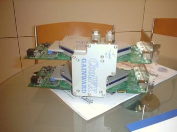 What's better than two graphics cards in SLI mode? Why, that'd be two watercooled graphics cards in SLI mode. We've got a couple of pictures in from CeBIT of Gainward's CoolFX solution for their SLI setups.