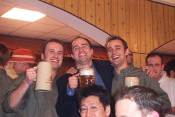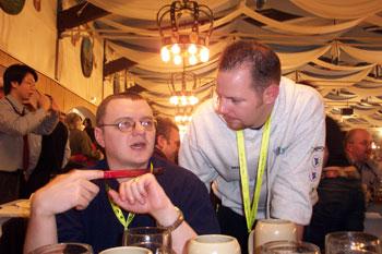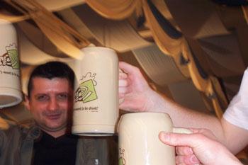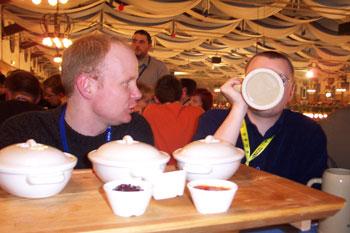 While waiting for food to arrive, we tucked into some beer - it is Germany after all - in NVIDIA's special one litre steins. You can see NVIDIA's Stephan Quentin, who's responsible for Southern European Product PR, benchmarking the stein's ability to correctly hold a carbonated alcoholic beverage and dispense it in a fashion that's conducive to getting plastered, along with the X86 Secret guys, Raphael and Samuel, who wisely manouvered out of shot just in time.