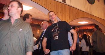 Hardinfo's John Fabricius watches the always-hammered 'Wavey' Dave Baumann, EIC of Beyond3D. Now you know where the Wavey comes from. I met John for the first time at the party, along with his Dad, and they're both mad vikings. If you ever do CeBit, make sure and have a beer or twelve with the Fabricius father-son combo.