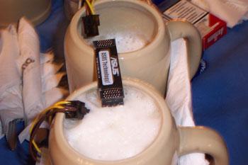 All that was left was to help NVIDIA develop their next generation of SLI technology. An idea hatched by X86 Secret's Samuel, ably assisted by Raphael, Stephan, the Wavey One and myself, we've got the basics of the system up and running on the table. Multi-participant Drunken Rendering is the next big thing. Enough performance from the system enables anti-aliasing to be free, as your eyes blur one image into the next effortlessly.