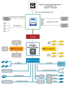 K8T900, which is designed for AMD Athlon 64 processors, is currently sampling to motherboard manufacturers. And it's rather heavy on the PCIe connectivity. It has provision for a single 16x link, or two 8x links for dual graphics cards, with up to six more PCIe links to play with too. This is part of VIA's crossfire RapidFire PCIe enhancement technologies. Four SATA 3.0Gbps drives can be hooked up to the K8T900, and the chipset also features VIA's Vinyl HD audio.