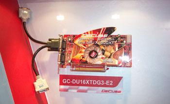 Dual chip Radeon X1600 has appeared on GeCube's stand, the Taiwanese vendor pairing two RV530s on the same PCB to create a single-board Crossfire product, codenamed Gemini. It's likely that two can be paired to do 4-chip Crossfire, too, sans master hardware on RD580.