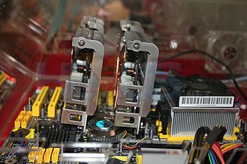 We've praised Mr. Uniwise -- GeCube's Jeff Fu -- time and time again on HEXUS for graphics cooler designs that simply are a cut above the rest, and one of his designs is strapped to Radeon X1600 XT and running in Crossfire mode on GeCube's stand, and it's completely fanless to boot.