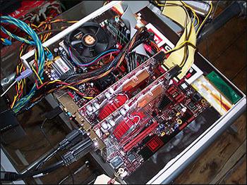 Since you'll never be able to buy the ATI reference board, we'll be cheeky and not show it to you in full. It's far too sexy for that and we'd rather you read the rest of the article instead of sitting there dribbling on yourselves. Here it is stuffed with X850 Crossfire Edition master and an X850 XT slave. Mmmmm, stuffed.And if you remember a recent HEXUS.pipelines post, the lane remap PCB and DMS-59 connector for Crossfire were sneakily published for all to see.
