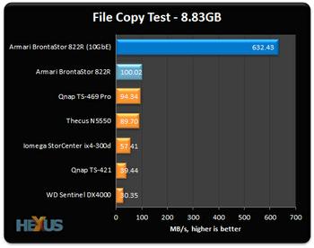 Our File Copy test entails copying an 8.83GB directory of mixed-sized files from our client to the server. The bandwidth available to the BrontaStor's 10 Gigabit interface means that it is able to complete the transfer in under 14 seconds.